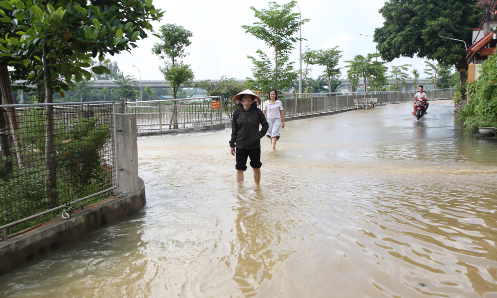 Nước trên sông Cầu đã rút nhưng khu phố Quả Cảm, phường Kinh Bắc vẫn ngập sâu, người dân đi lại khó khăn.