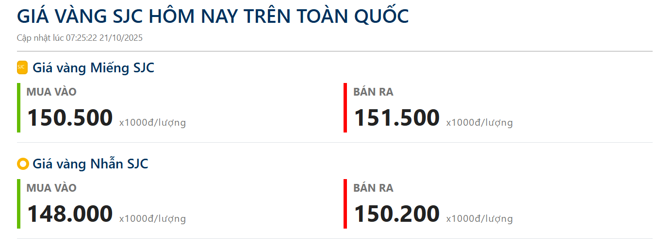 Cập nhật sáng 21/10 của PV Dân Việt, giá vàng hôm nay SJC giao dịch ở mức 150,5 – 151,5 triệu đồng/lượng mua – bán, không biến động so với chiều qua. Đây cũng là giá mua – bán tại các thương hiệu khác như DOJI, PNJ… Chênh lệch mua vào – bán ra duy trì ở ngưỡng 1,5 triệu đồng/lượng.